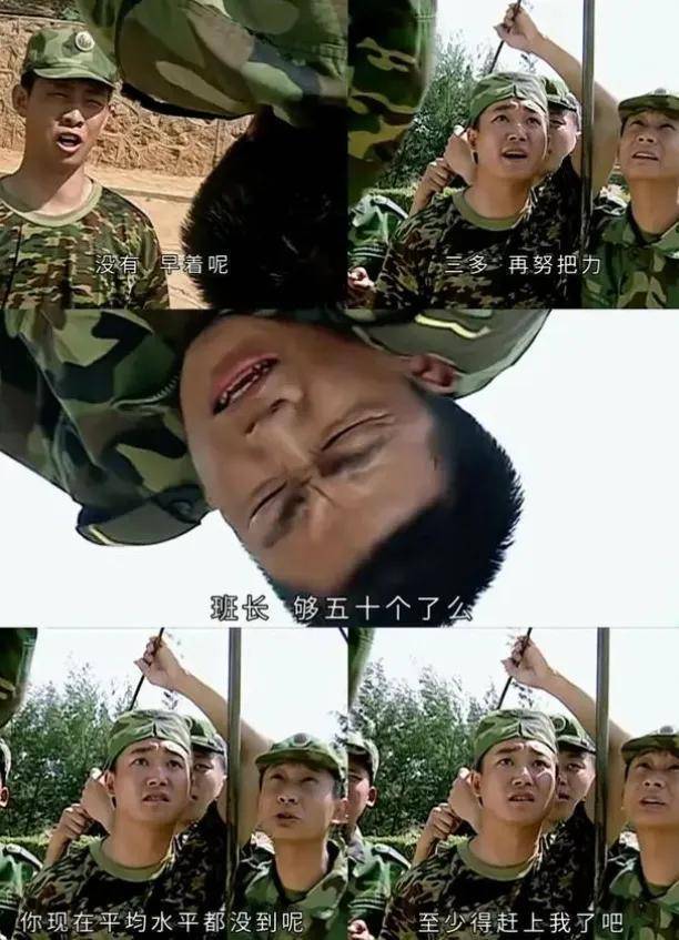 还有《士兵突击》里王宝强的名场面,许三多做腹部绕杠训练时,用力过猛,帽子不小心掉了。